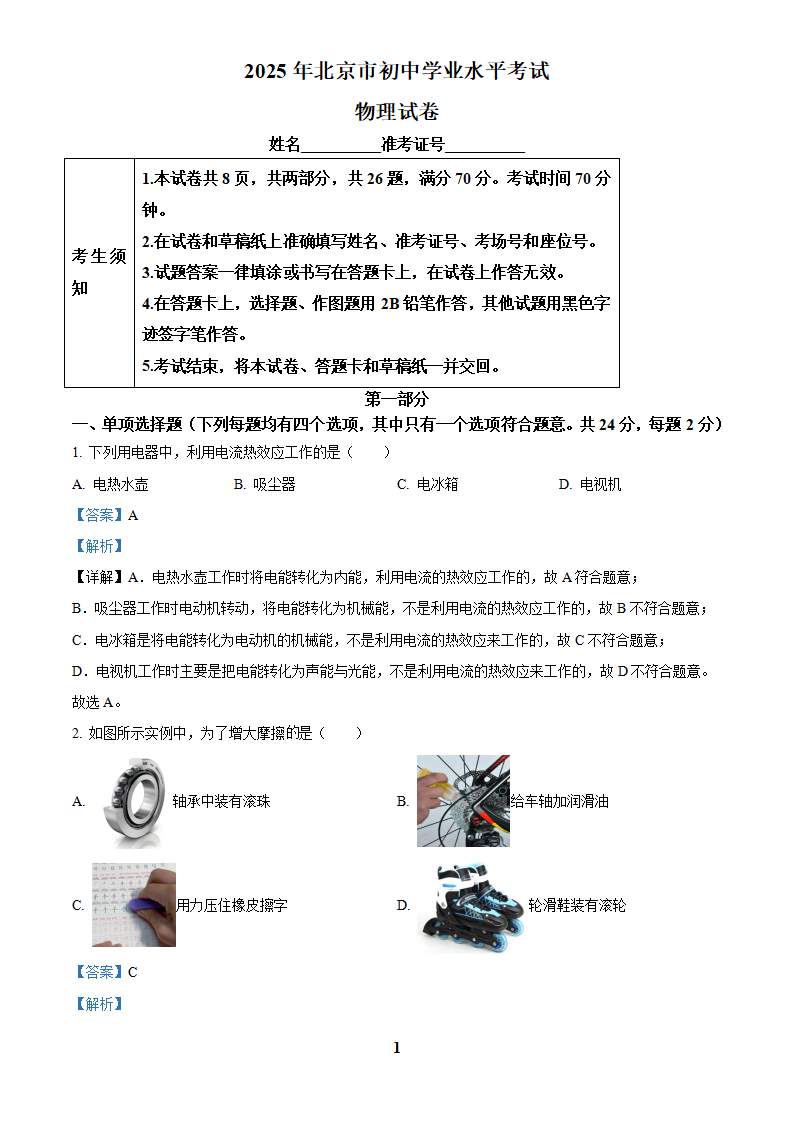 首页 物理试卷 中考物理 2025年中考北京市物理试题+答案解析Word版
