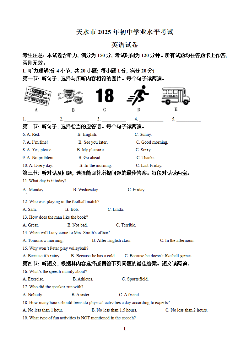 首页 英语试卷 中考英语 2025年中考甘肃省天水市英语真题+答案解析Word版