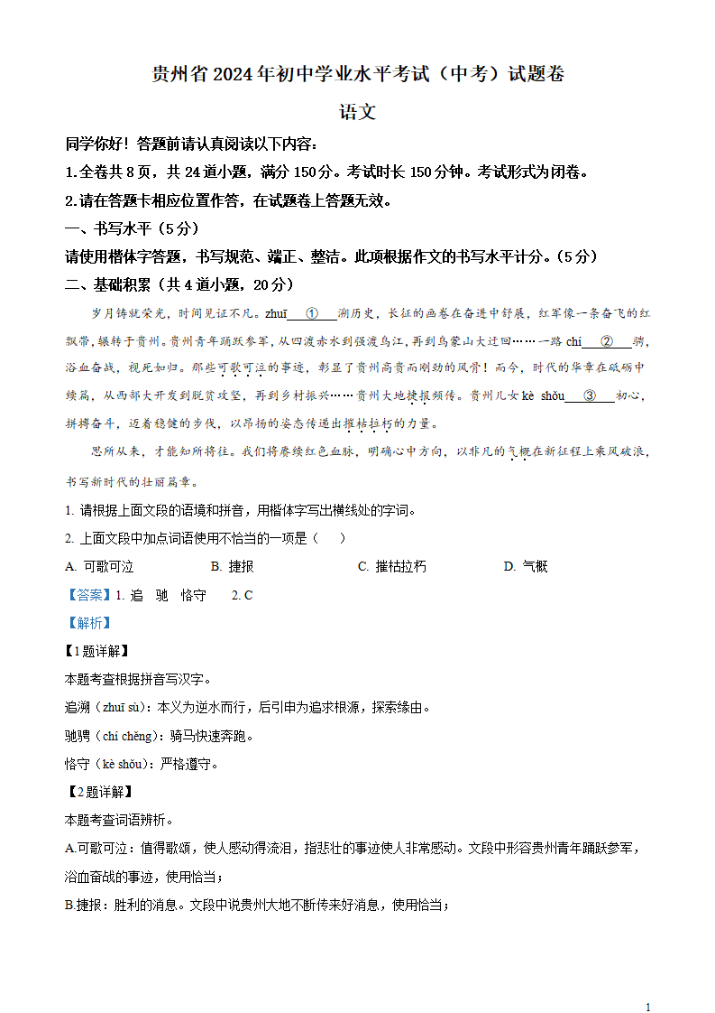 首页 语文试卷 中考语文 2024年中考贵州省语文真题+答案解析Word版