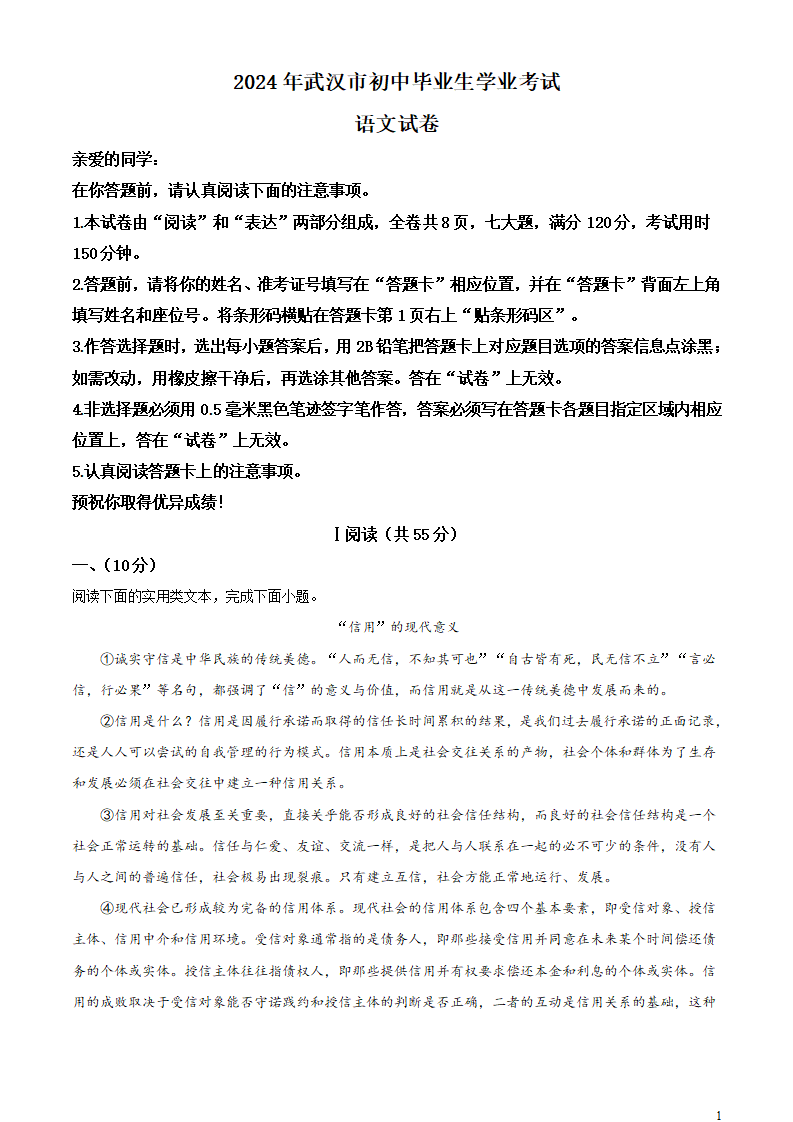 首页 语文试卷 中考语文 2024年中考湖北省武汉市语文试题+答案解析Word版