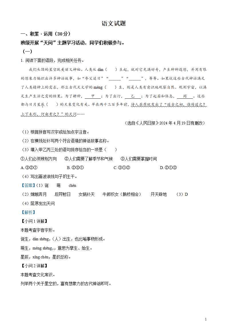 首页 语文试卷 中考语文 2024年中考江苏省连云港市语文真题+答案解析Word版
