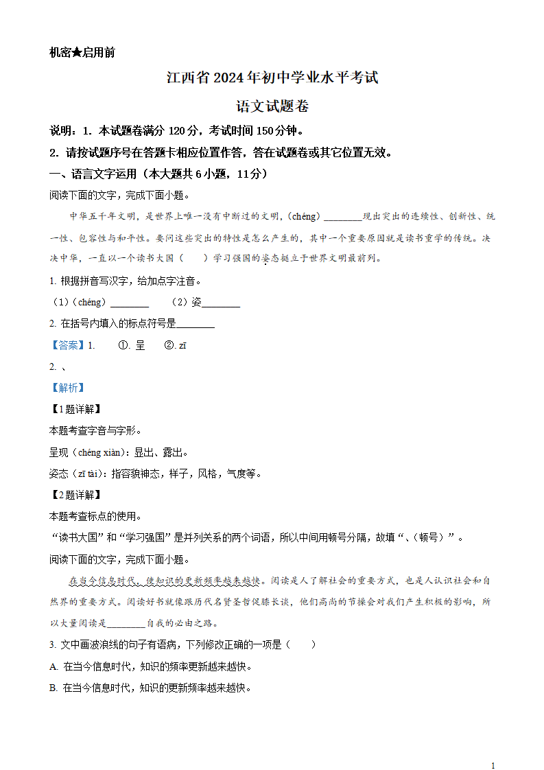 首页 语文试卷 中考语文 2024年中考江西省语文试题+答案解析Word版