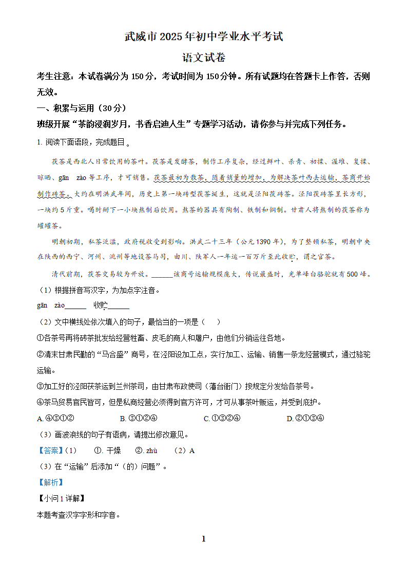 首页 语文试卷 中考语文 2025年中考甘肃省武威市语文真题+答案解析Word版