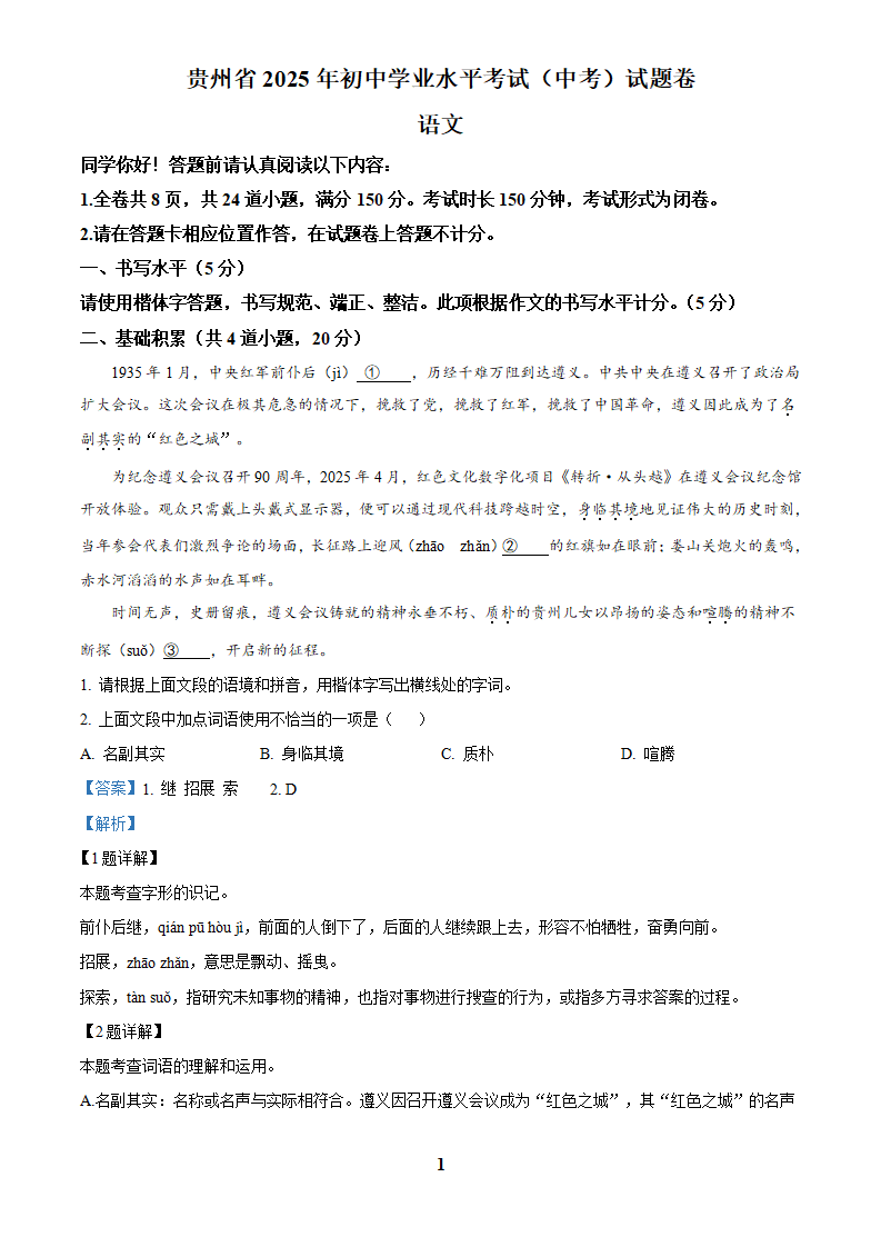 2025年中考贵州省语文真题+答案解析Word版